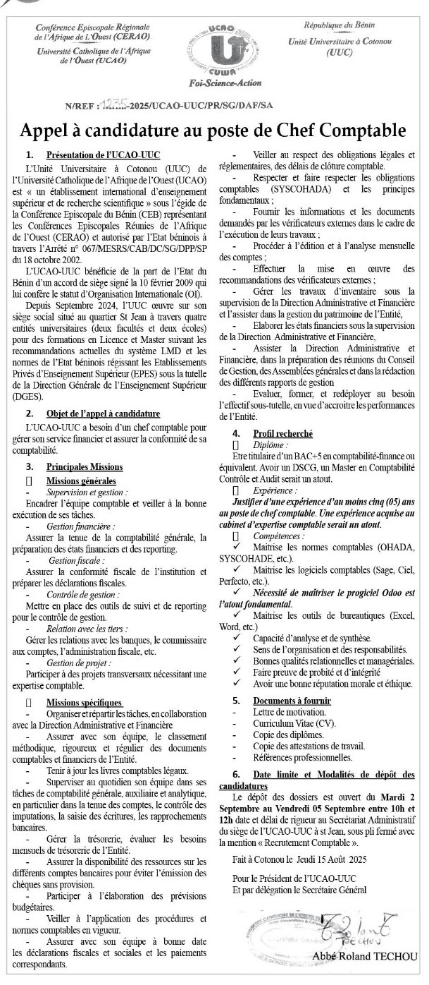 L’UCAO-UUC recrute un Chef Comptable pour gérer son service financier et assurer la conformité de sa comptabilité. Voir les détails de l’appel à candidature dans l’image ci-dessous, dans la galerie. Galerie