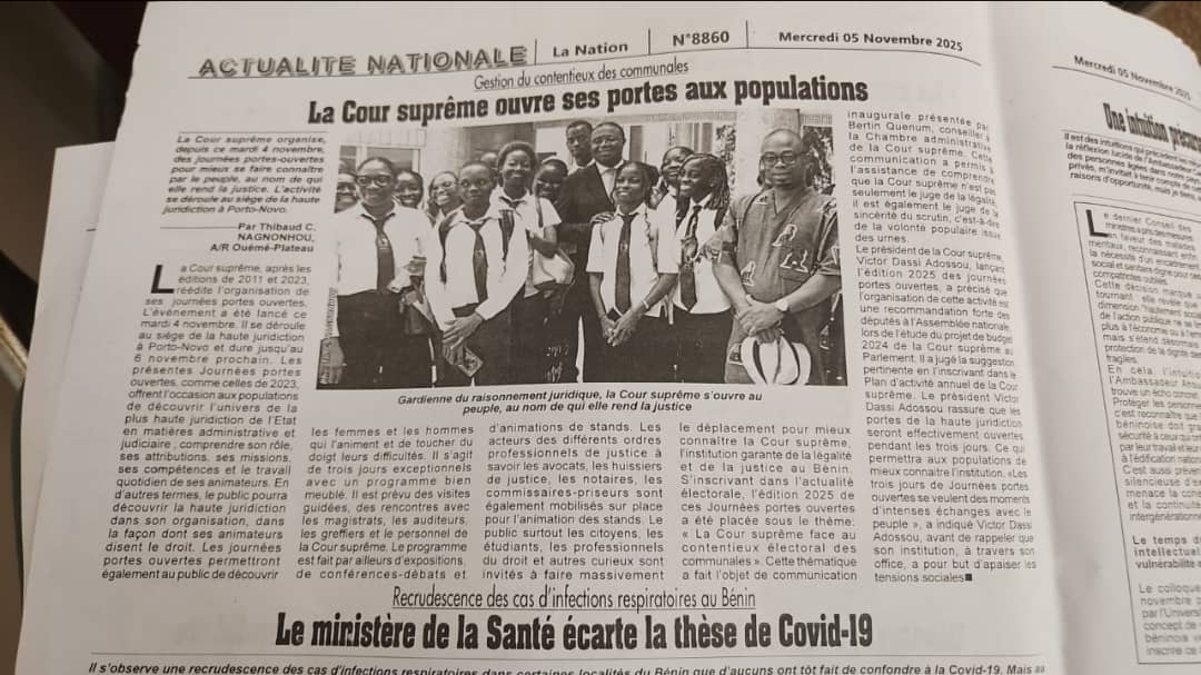Sur invitation du Président de la Cour Suprême du Bénin, une délégation des étudiants de la Faculté de Droit et d'Économie (FDE) de l'UCAO a pris part ce mardi 4 novembre 2025 au lancement de la 3ème édition des Journées Portes Ouvertes de la Cour Suprême au siège de l'institution à Porto-Novo, en présence des acteurs judiciaires, des auditeurs, greffiers de la Cour et de nombreux citoyens.