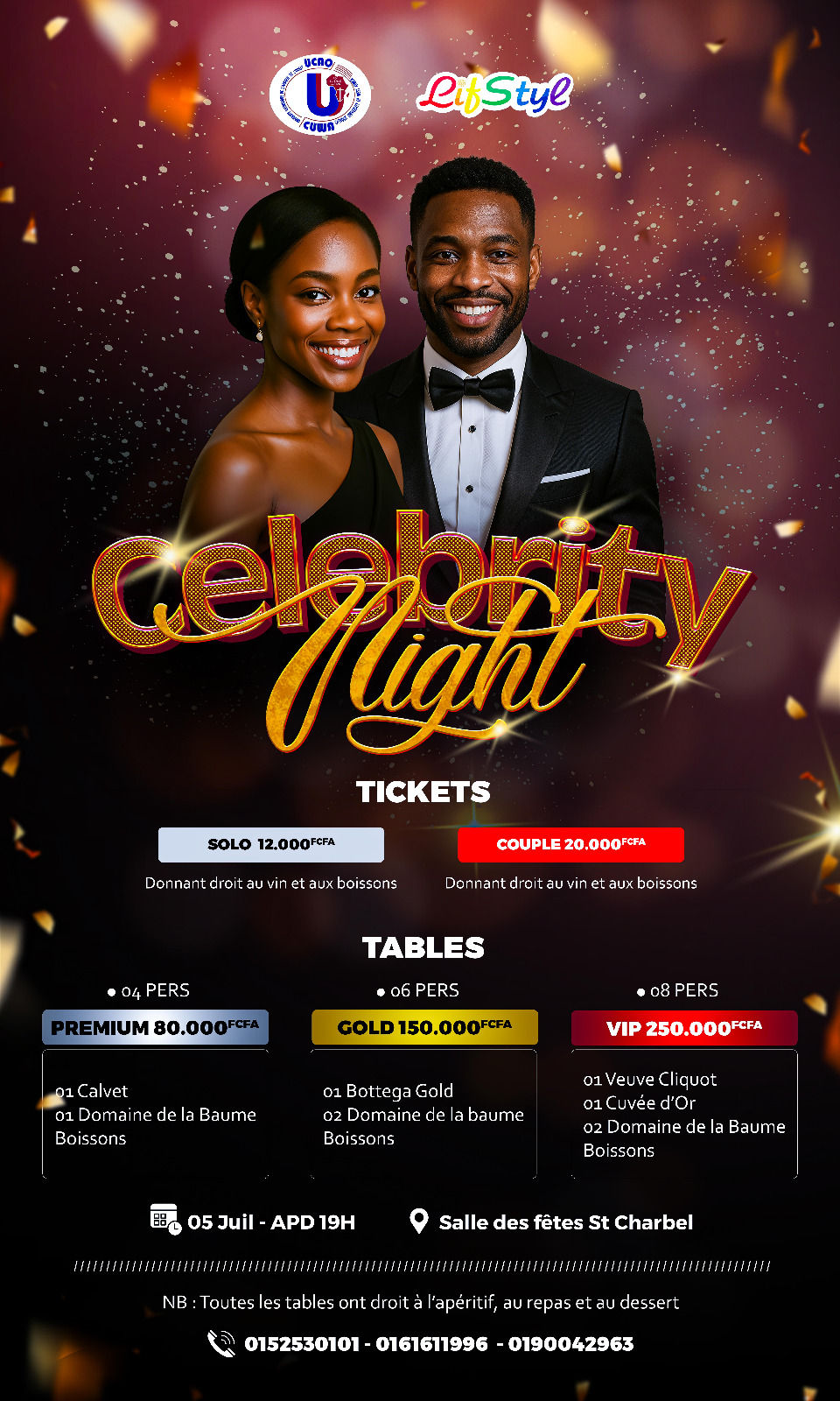 L'événement "Celebrity Night" aura lieu le 05 juillet à 19h à la salle des fêtes St Charbel (Akpakpa). Il s'agit d'une soirée élégante organisée par la BEE UUC et LifStyle.