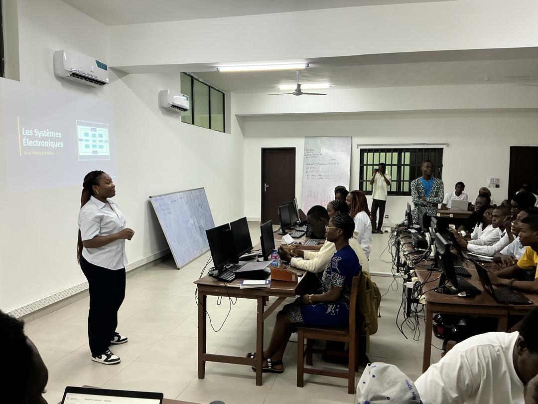 Invitée d’honneur de la première séance de formation des challengers de l’Olympiade Universitaire de Robotique, organisée par l’Association Scientifique UCAO-TECH, elle a partagé son expertise aux côtés de Dodji Virgile TCHIDEHOU, étudiant en Informatique Industrielle et Maintenance et organisateur général de l’UCAO-TECH.