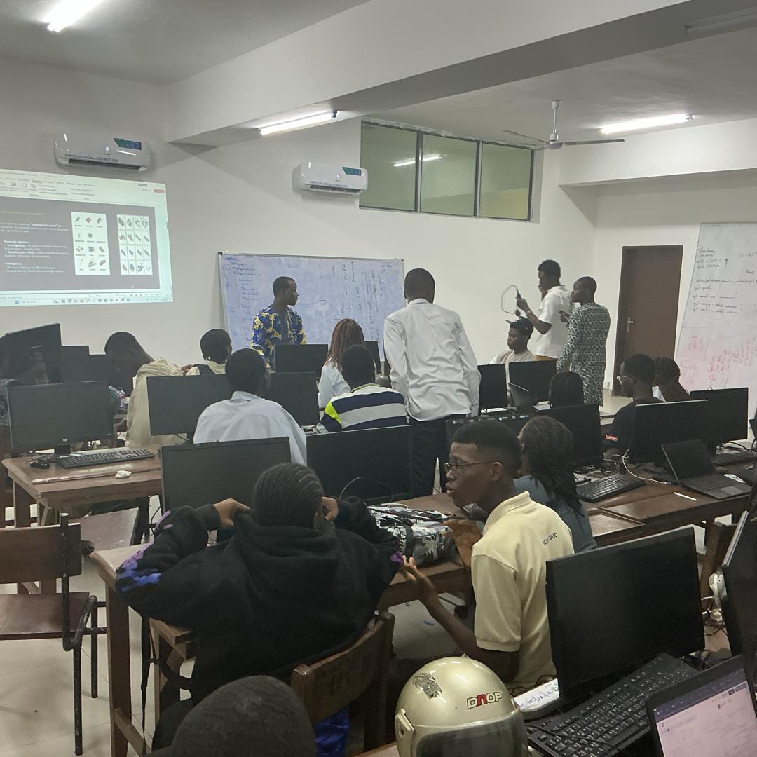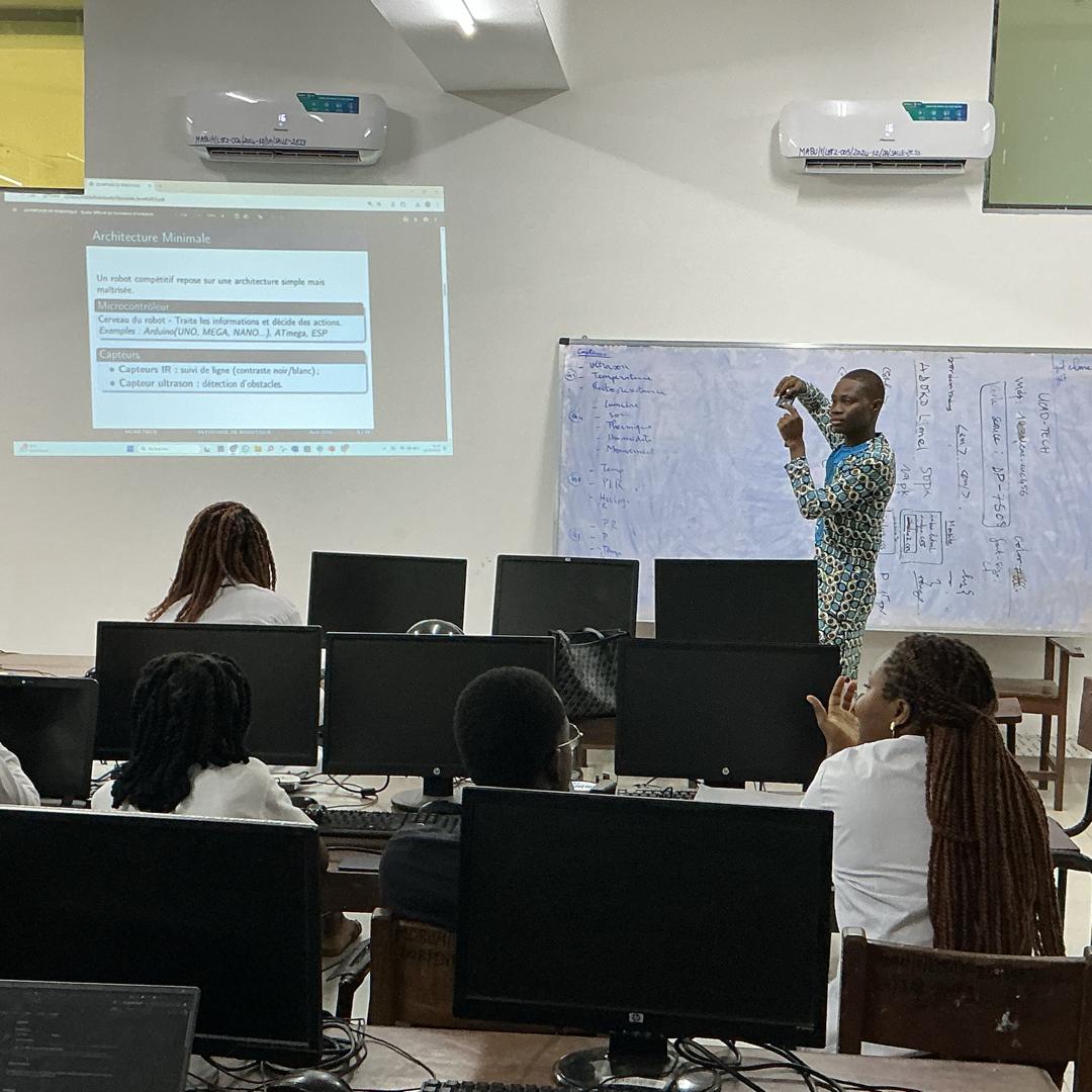 La formation a porté sur les fondements des systèmes électroniques : identification des composants, compréhension de leur architecture et illustrations à travers des applications concrètes du quotidien. En complément, M. TCHIDEHOU a exposé les principes essentiels à la conception d’un robot autonome performant, insistant sur la rigueur technique, la maîtrise des bases et la stratégie d’ingénierie.